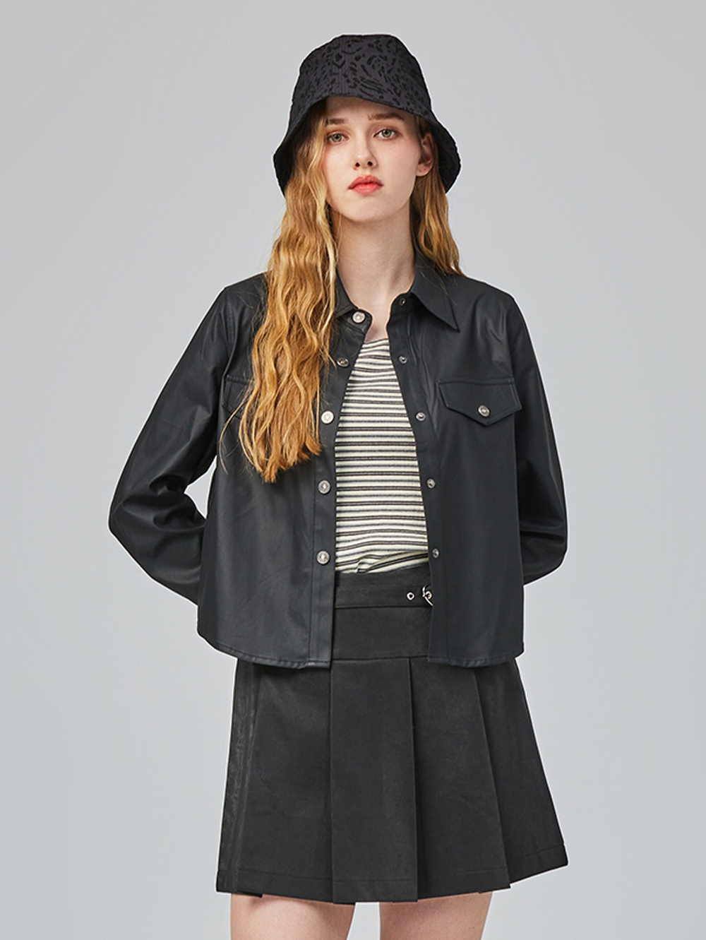 *短版修身剪裁 *內搭條紋背心,彈性柔軟親膚 *特殊皮革面料 *秋季個性休閒穿搭