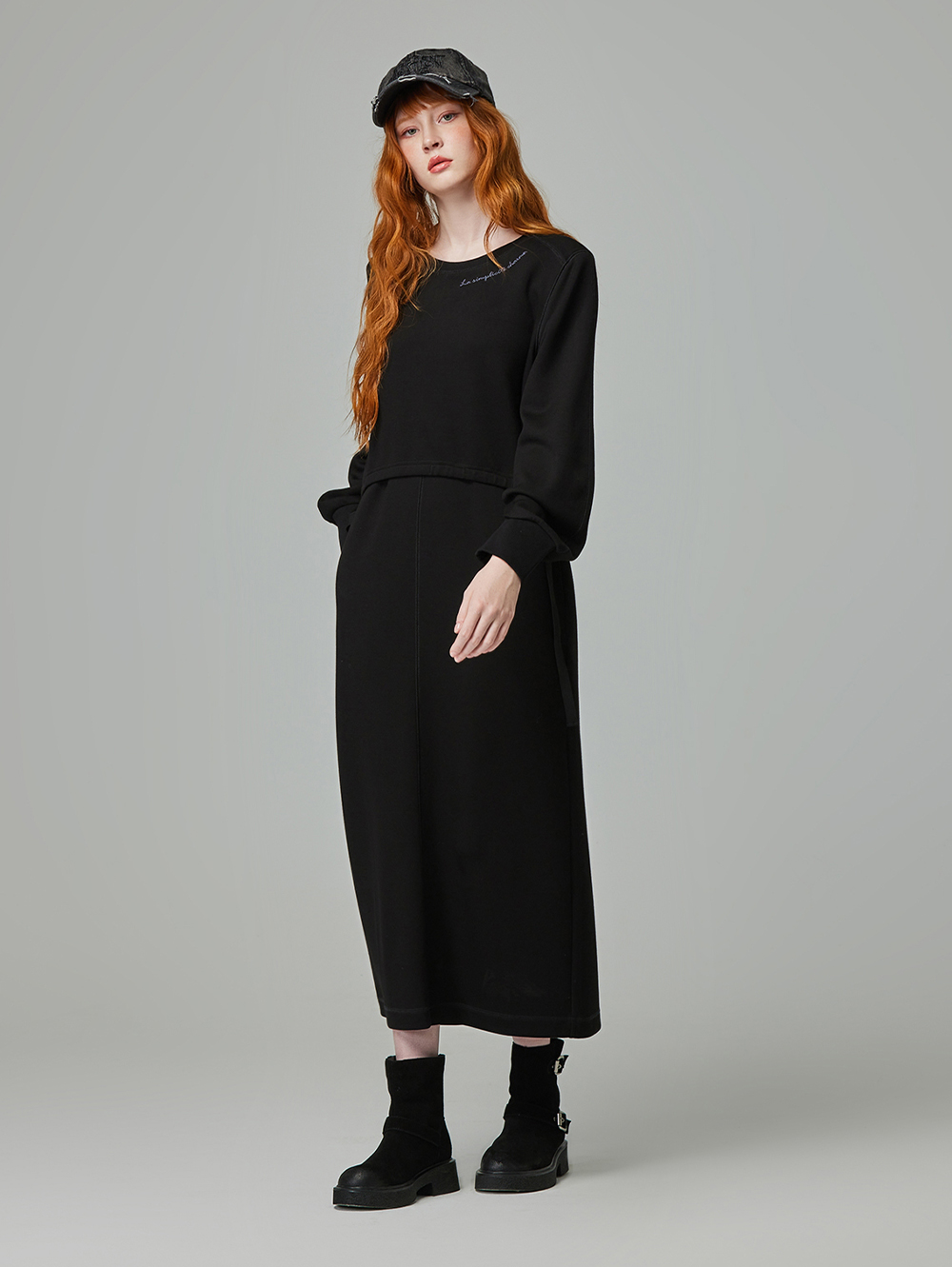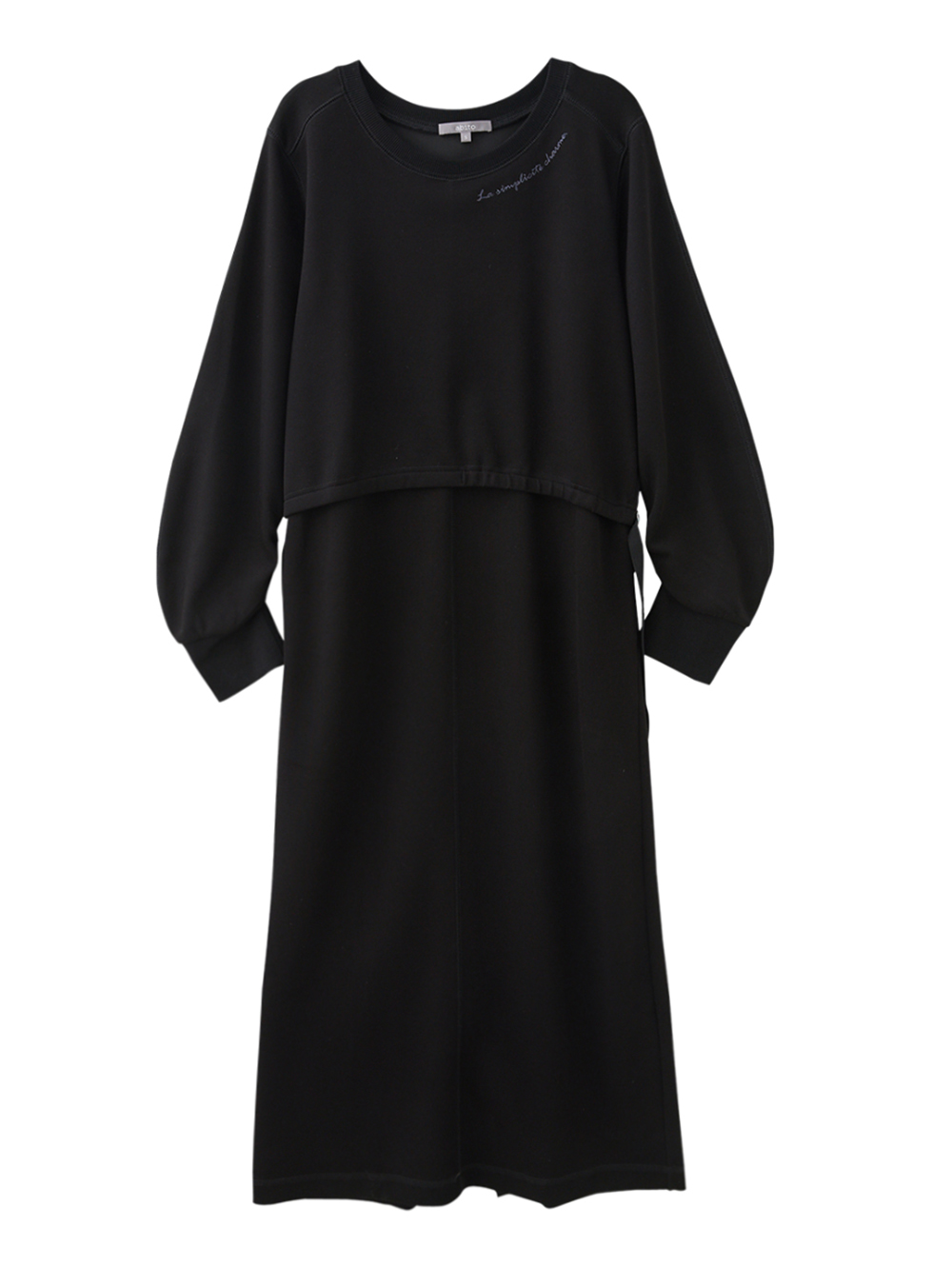 *刺繡文字造型細節 *衣身下擺抽繩設計,修飾腰線 *袖子側邊抽皺細節 *假兩件式洋裝版型
