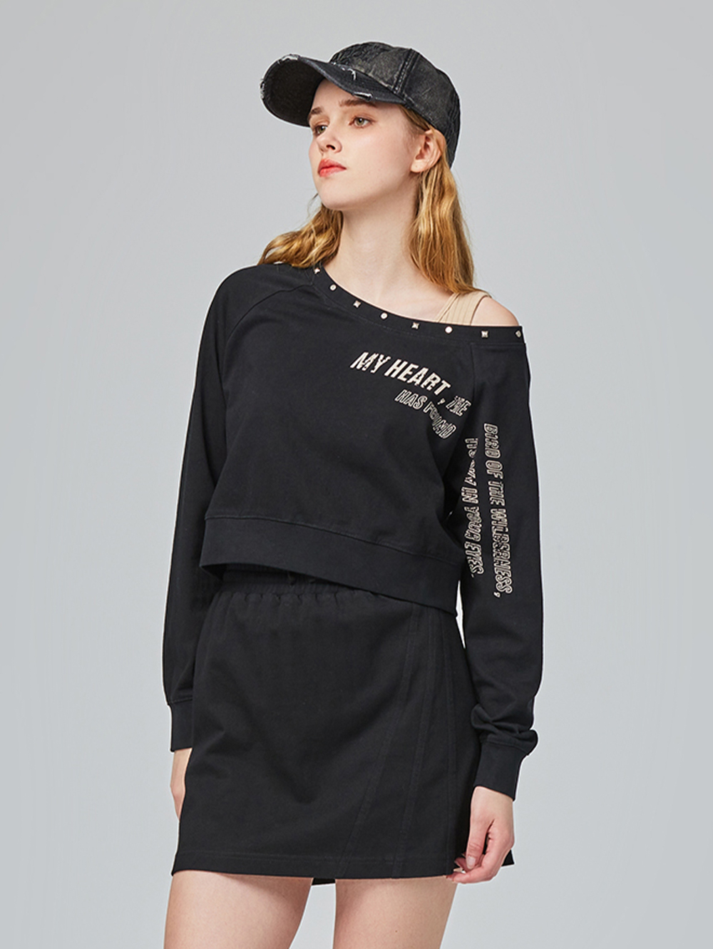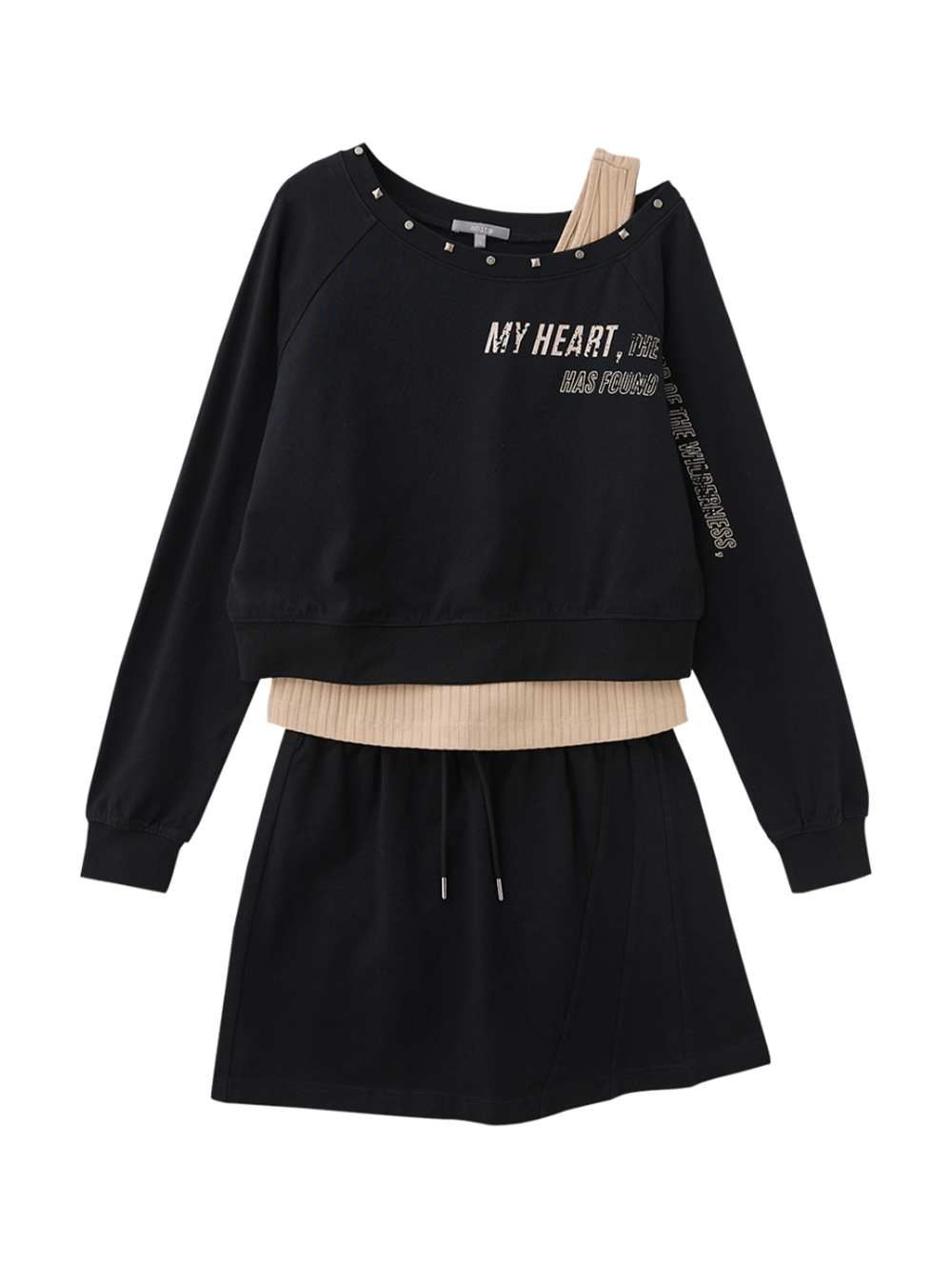 *斜肩短版長袖剪裁上衣 *斜肩金屬裝飾細節 *特殊剪裁顯瘦短裙 *內搭羅紋柔軟彈性背心