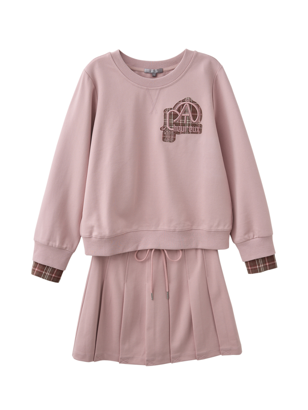 *上下身兩件式套裝 *上衣領口羅紋加強領口彈性與耐用 *格紋貼布繡細節 *鬆緊腰頭抽繩百褶裙