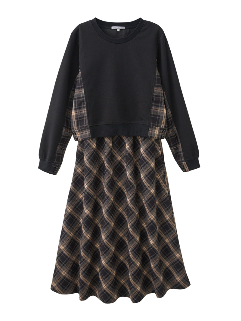 *上衣側邊格紋拼接設計 *圓領羅紋加強領口彈性與耐用 *內裡連身洋裝 *柔軟棉質面料