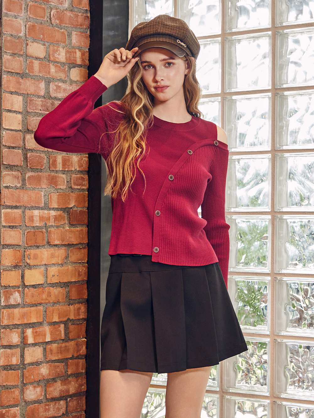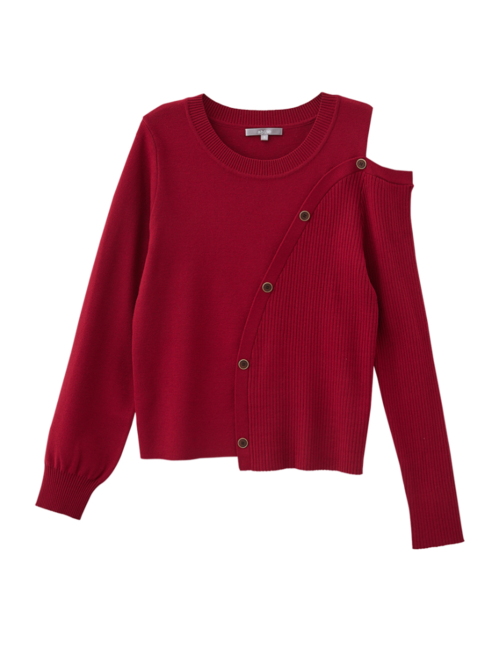 *落肩設計修飾手臂線條 *特殊不對稱剪裁裝飾扣 *面料柔軟彈性佳 *收腰版型顯瘦修身