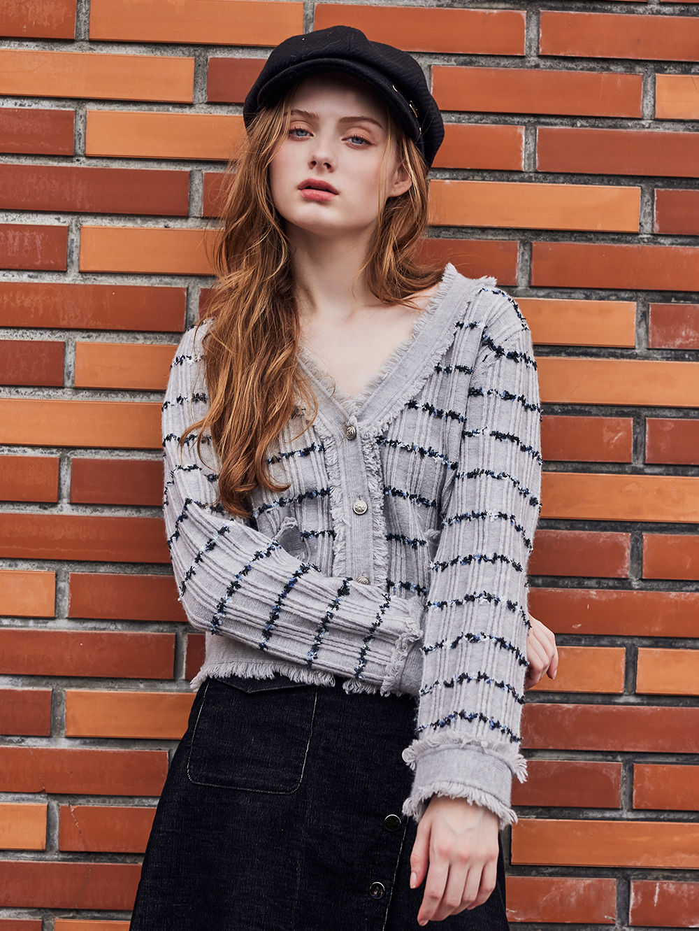 *虛邊絨毛造型細節 *V領前開釦可當罩衫或單穿 *跳色虛邊條紋紋路 *柔軟保暖面料