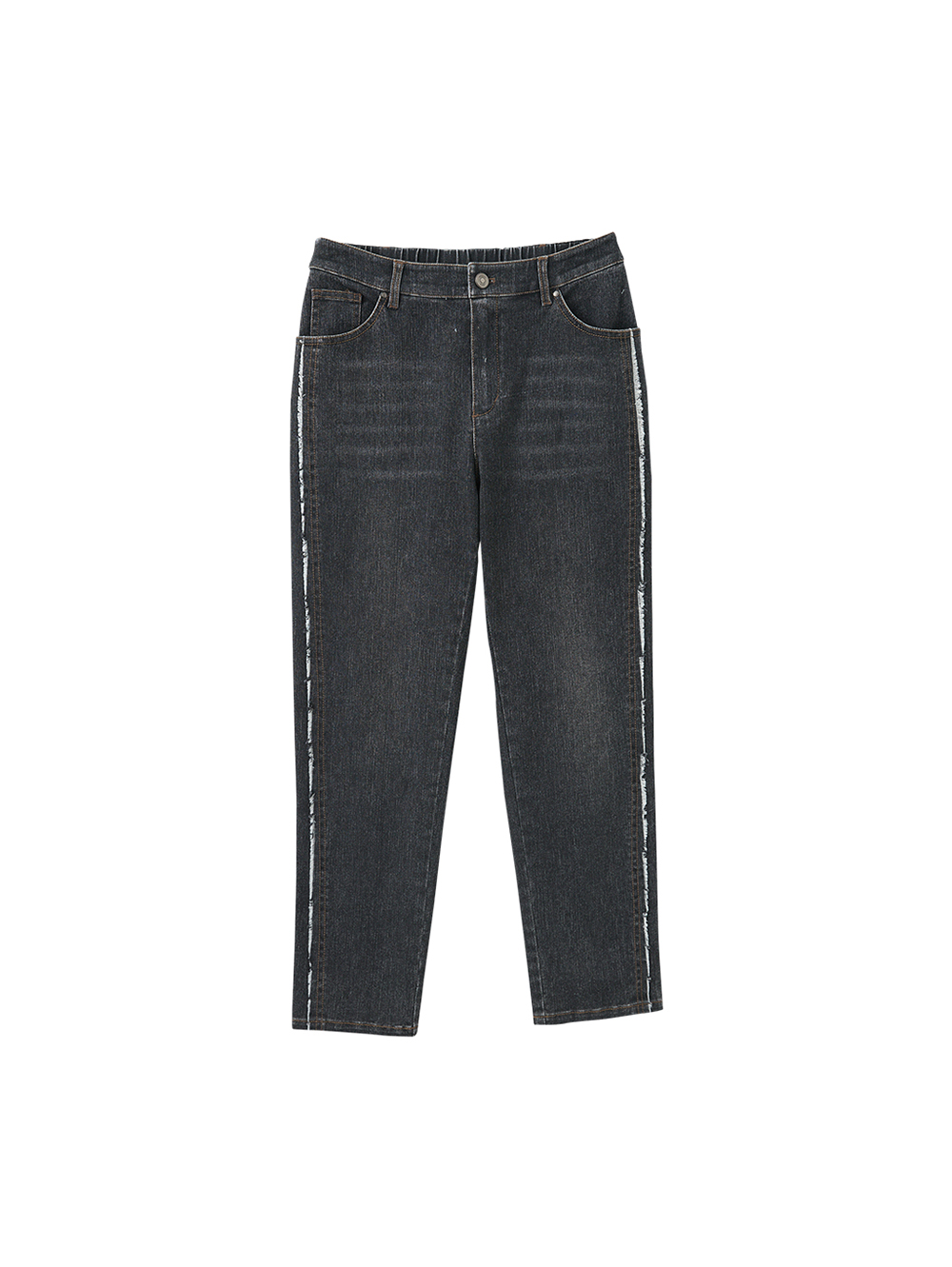 俐落修身直筒褲型, 兩側抽鬚細節增加休閒隨性感。
