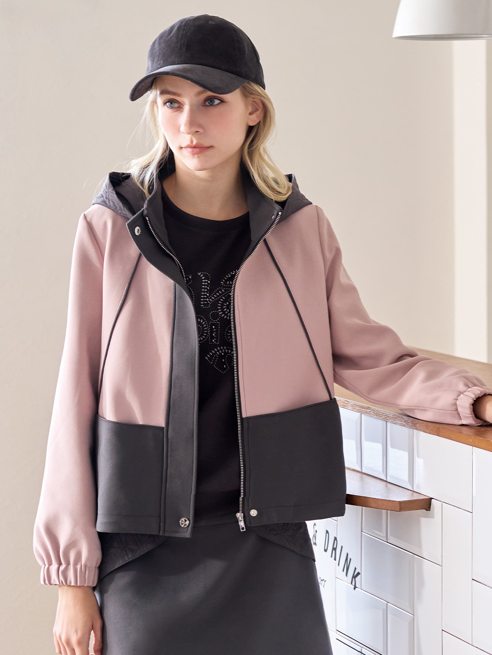 雙色效果與異素材绗縫連帽拼接設計, 輕鬆休閒, 好活動易穿搭, 搭配同系列短裙更俏麗時髦。