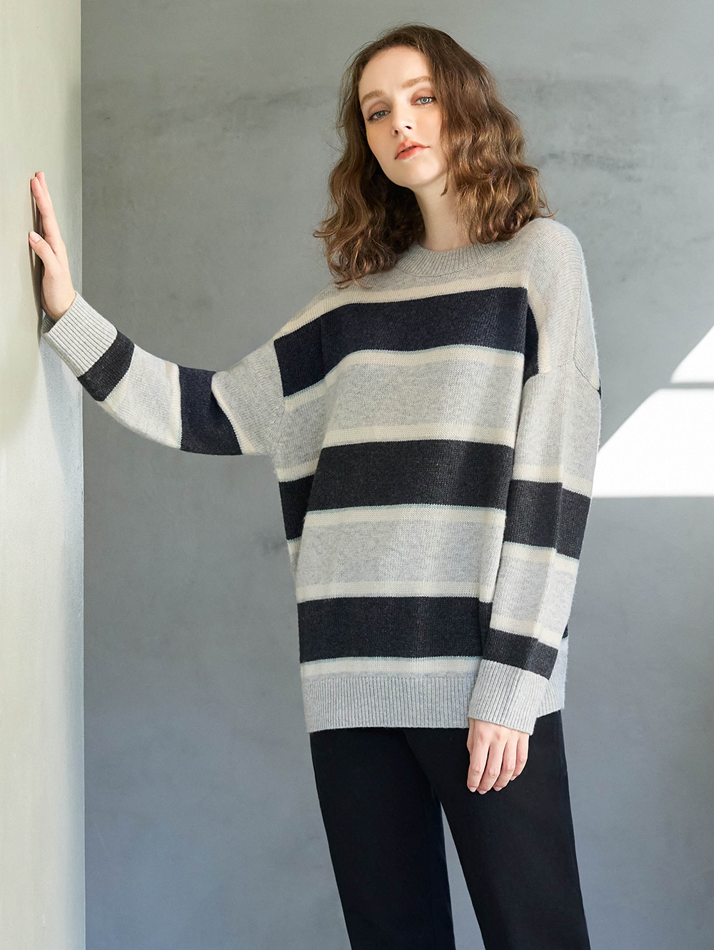 採用35%的羊毛混紡, 保暖不厚重, 柔軟舒適兼具。寬條紋設計展現活潑視覺, 落肩微寬鬆剪裁輕鬆修飾上身比例。
