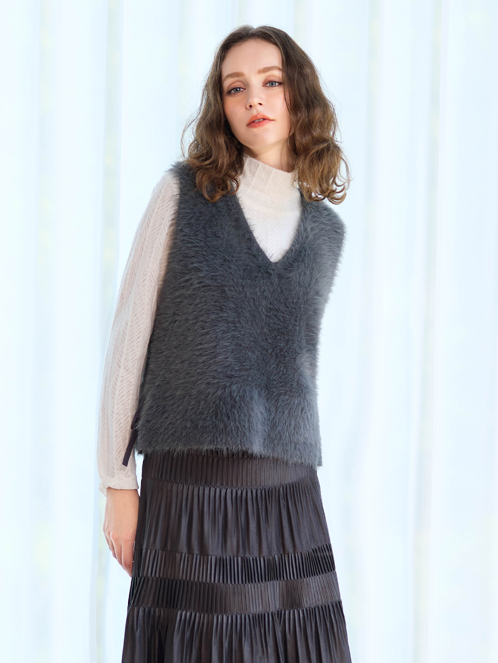輕盈保暖營造溫柔層次感, 微鬆版型搭配V領剪裁, 修飾臉型延伸頸部線條, 讓整體造型更顯俐落柔和。