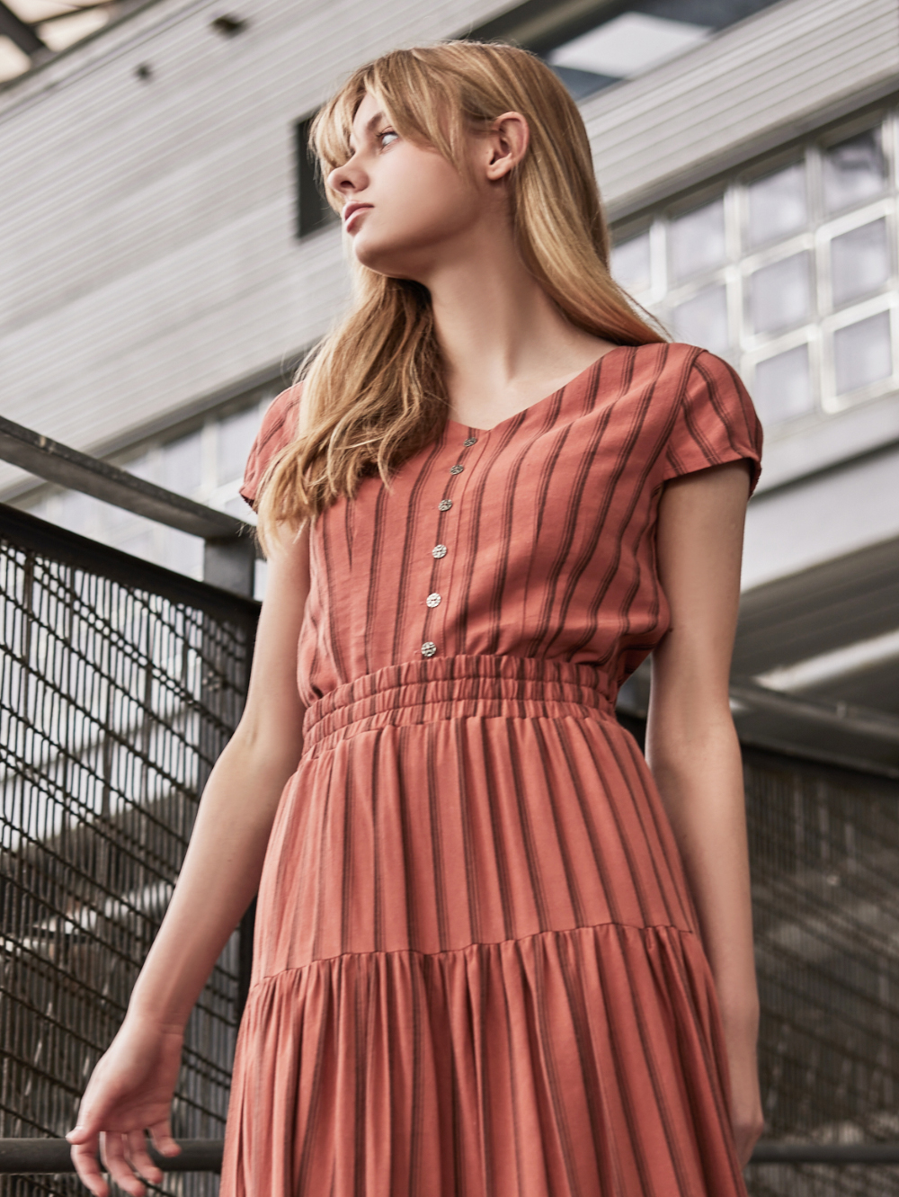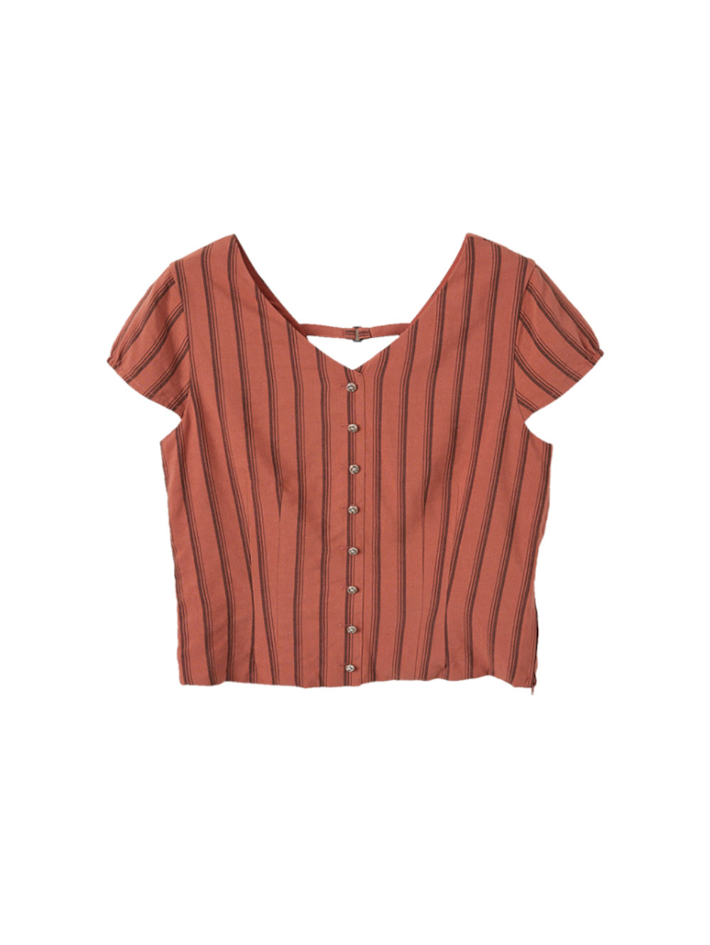 V領剪裁可修飾頸部及臉部線條,版型顯身材又有精神,正面有整排精緻的金屬釦,背部有畔帶細節,搭配同系列長裙,氣質又亮眼。