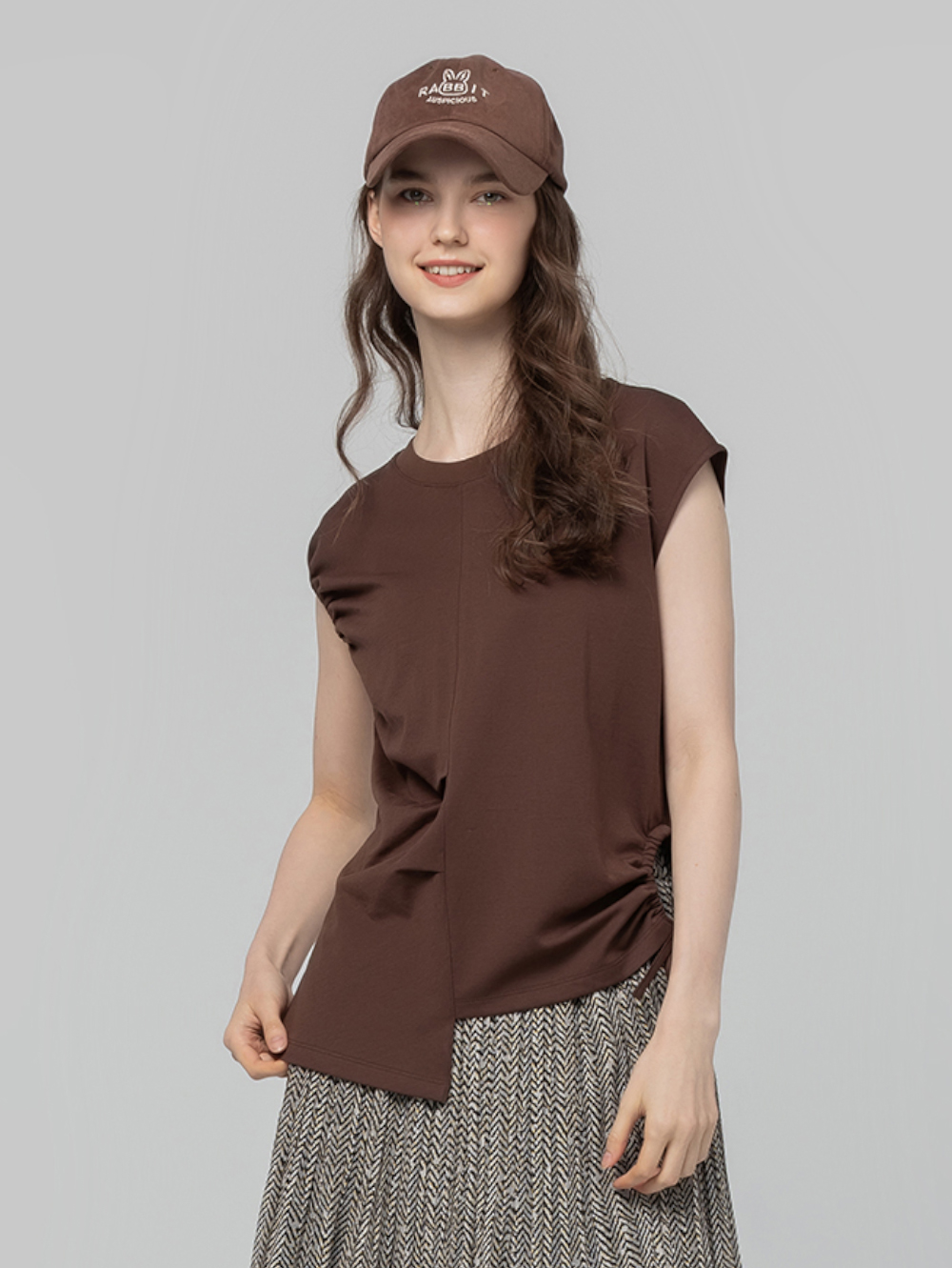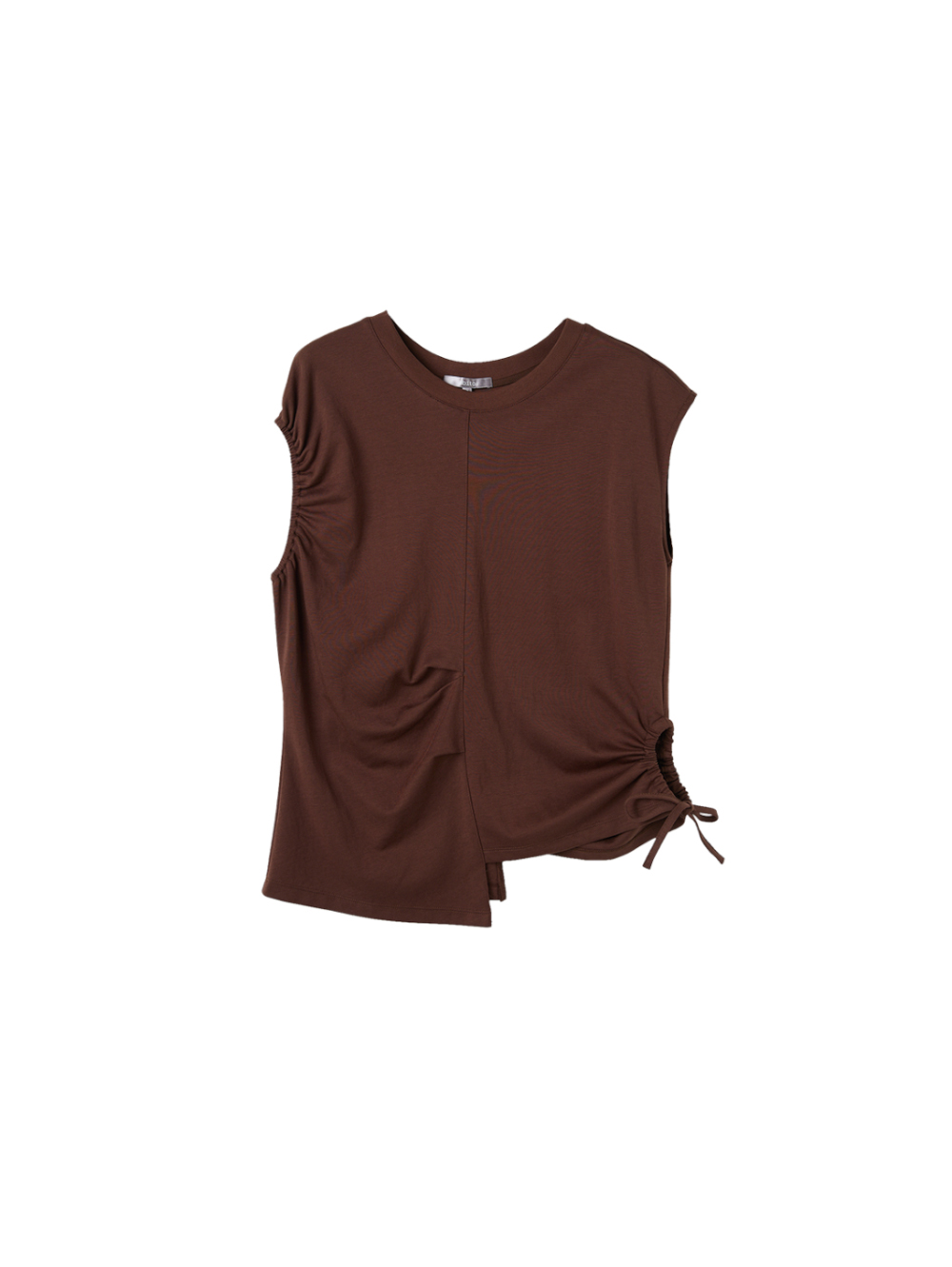 素面短袖上衣,不對稱的特殊剪裁,小抓褶與抽繩綁結充滿設計感,有質感又耐看。