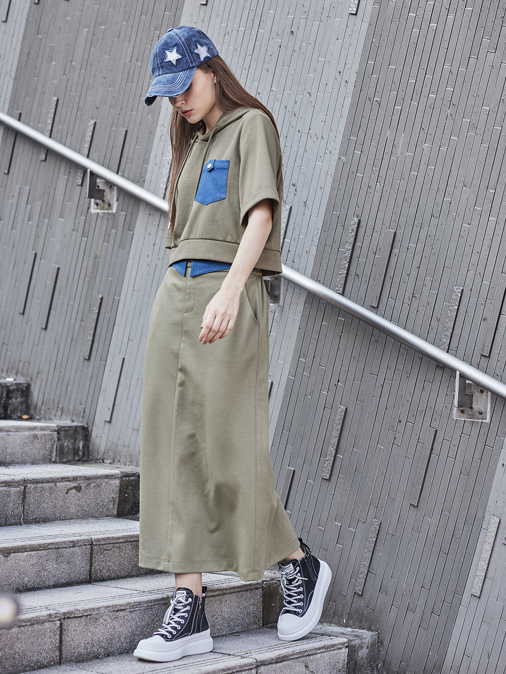面料舒適親膚,腰頭的牛仔裝飾片為可拆式,可依照穿搭風格自行組裝。