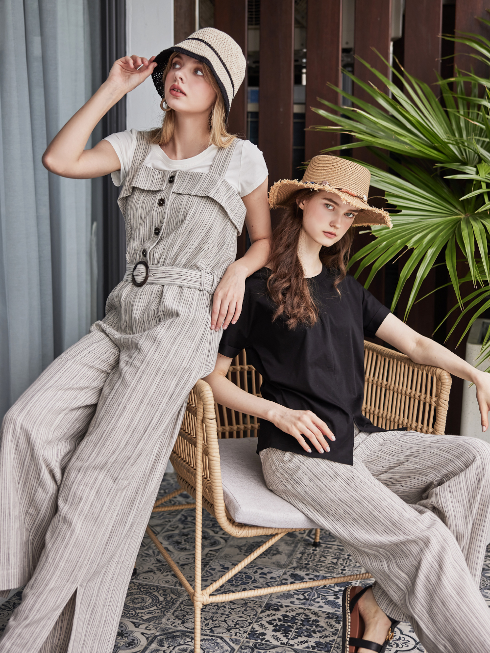 直條紋的布料讓視覺效果更顯腿長。清爽的棉麻材質,做成吊帶褲型,俏皮又有特色。附贈短袖內搭,CP值爆表。