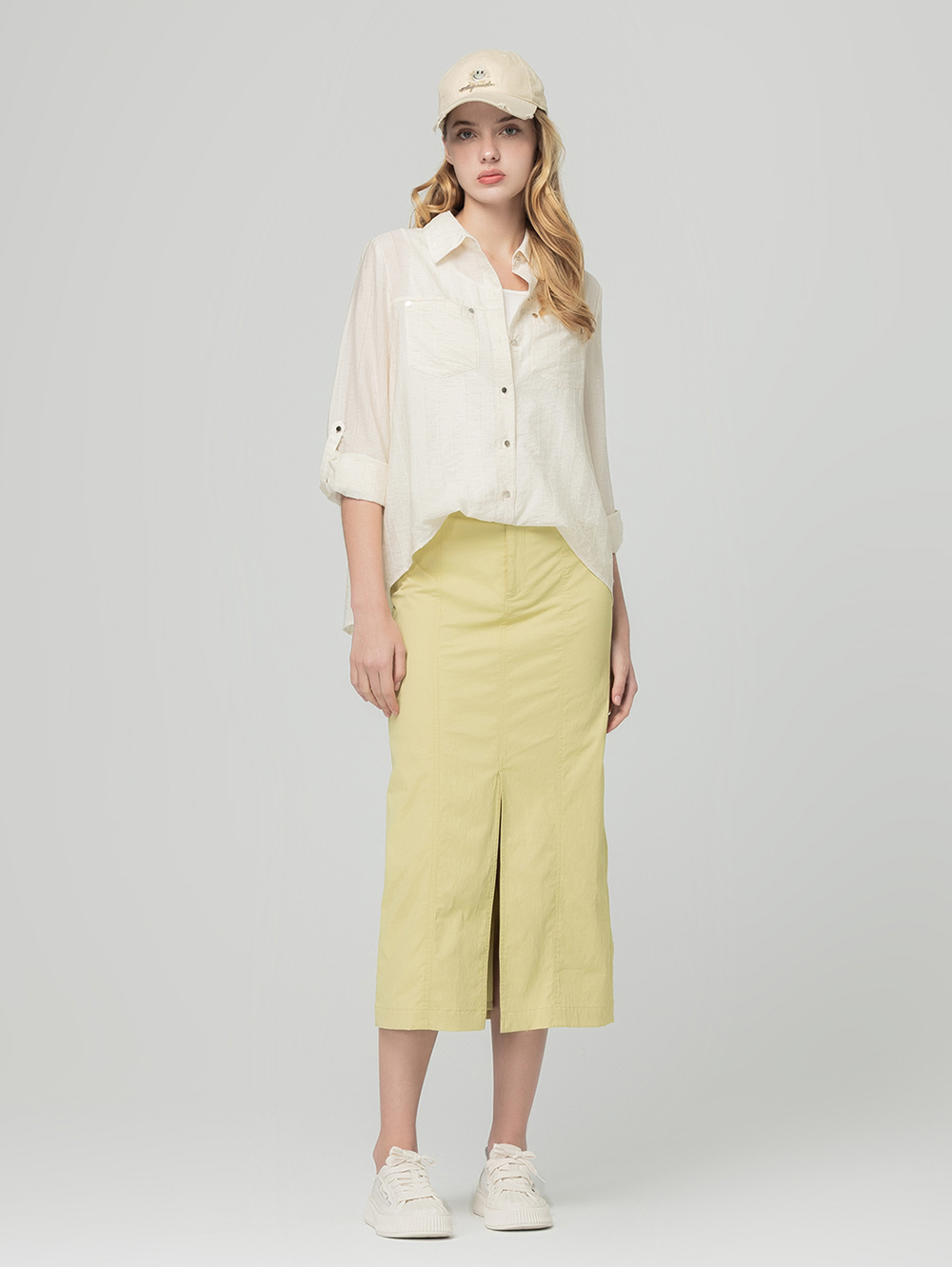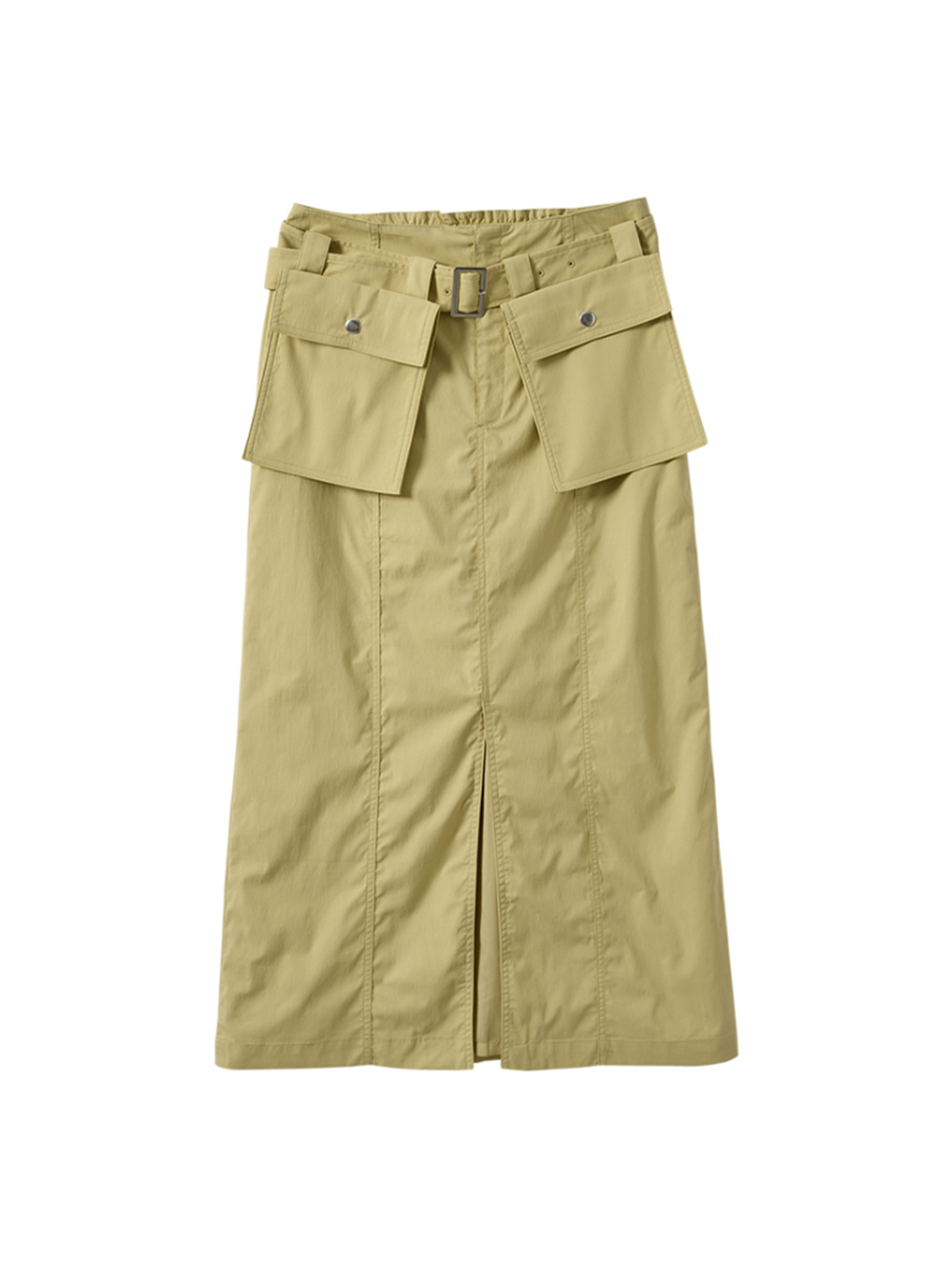 *口袋可拆式任意搭配 *前中開衩設計 *寬腰帶及裁片剪接顯比例 *面料具彈性