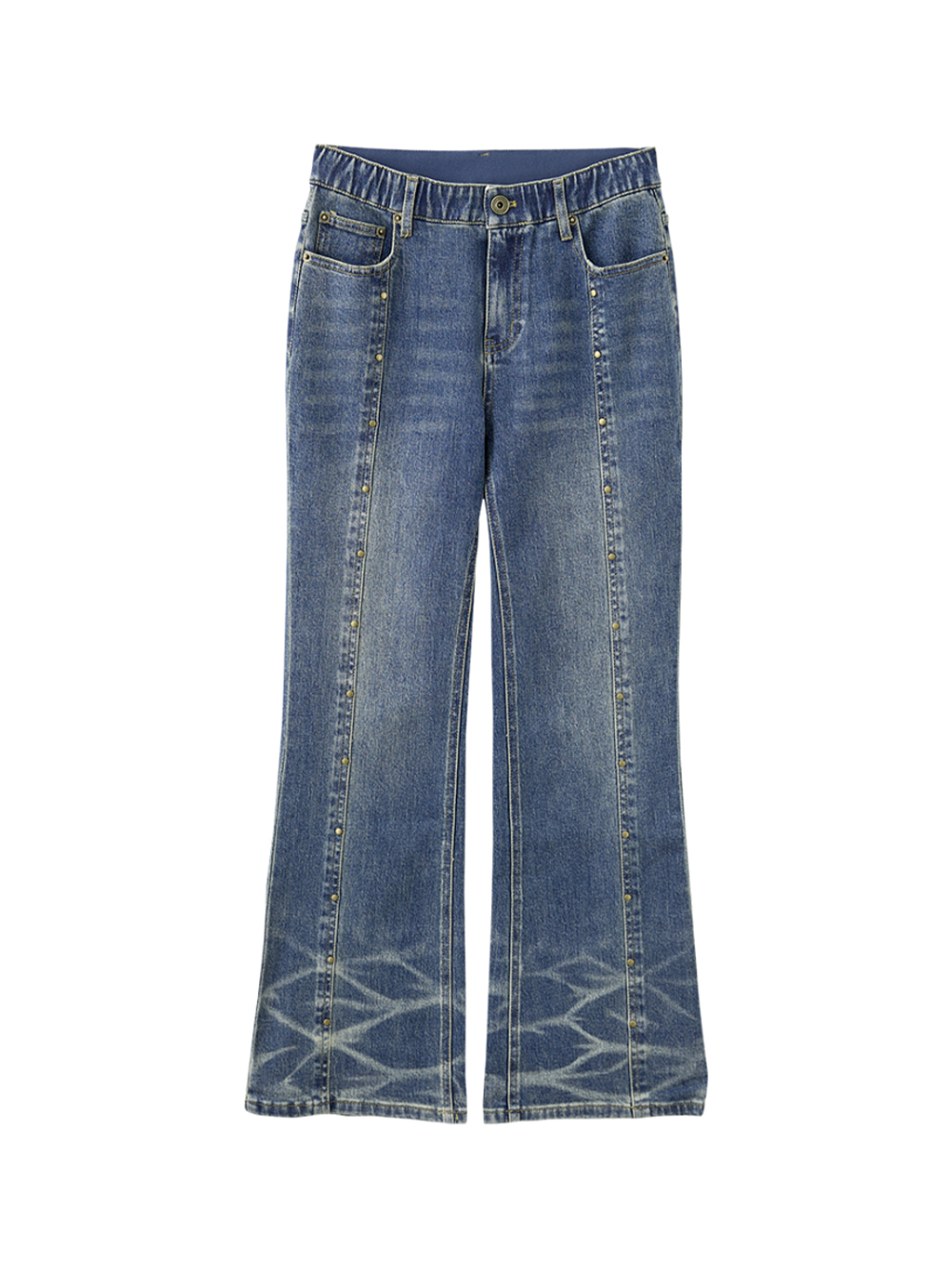 *復古洗舊牛仔面料 *褲管特殊水洗造型,呈現波浪紋路 *棉質彈性面料 *褲身鉚釘設計增添造型感