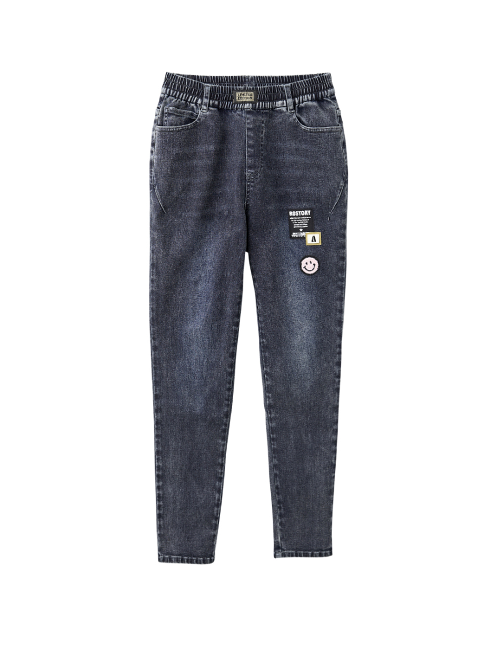 *可愛貼繡造型細節 *窄管直筒版型 *刷色水洗棉質面料 *鬆緊腰頭設計,方便穿脫