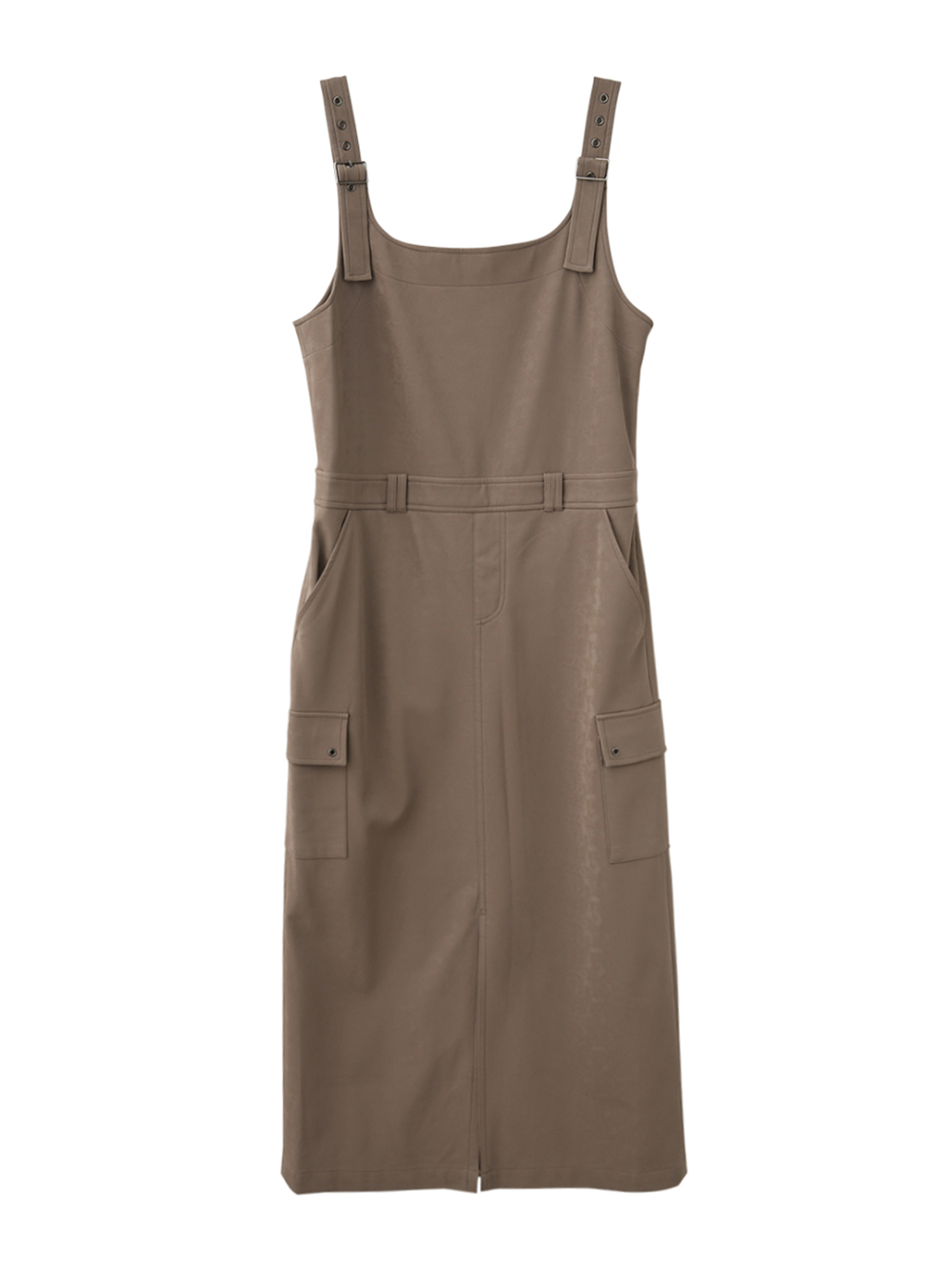 *調節式肩帶,可自由調整長度 *秋季皮革面料 *裙身立體口袋設計 *下擺前開衩,方便活動