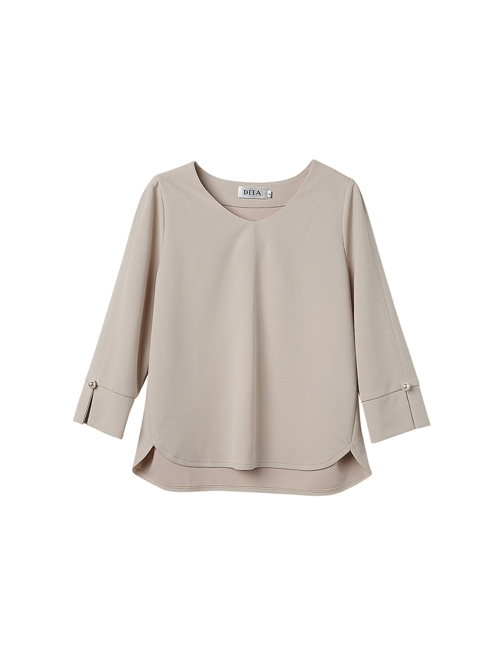 看似簡約的上衣,卻是非常修飾的七分袖上衣版型,袖口利用珍珠點綴,下身搭簡單的褲裝就能俐落有型,推薦給喜愛簡約時尚風格的你。