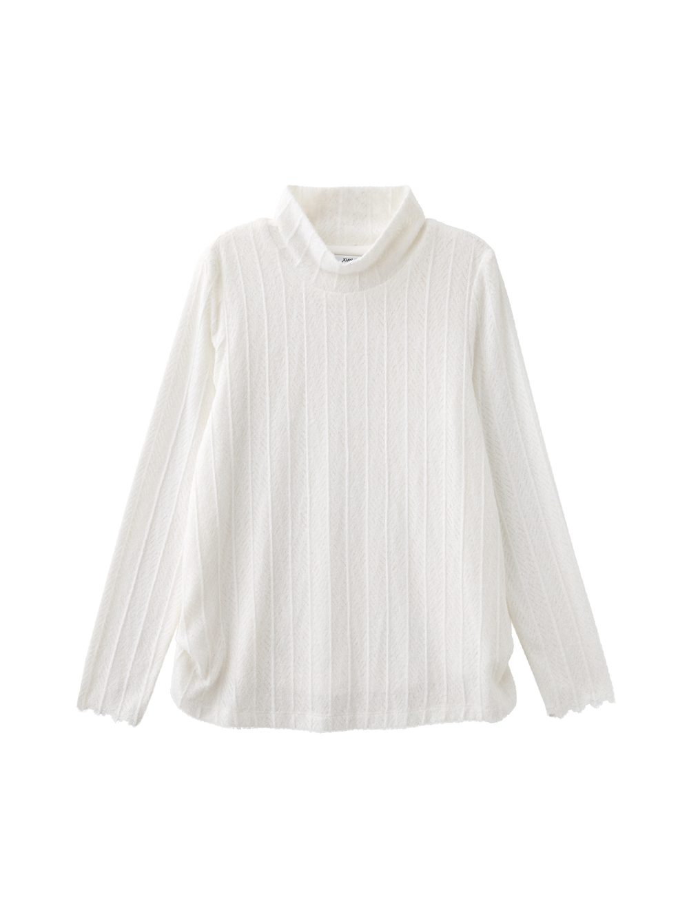 柔軟毛面彈性蕾絲交織細膩紋理, 展現若隱若現的層次美感。立領微鬆設計修飾頸部線條, 單穿優雅,內搭更顯質感。