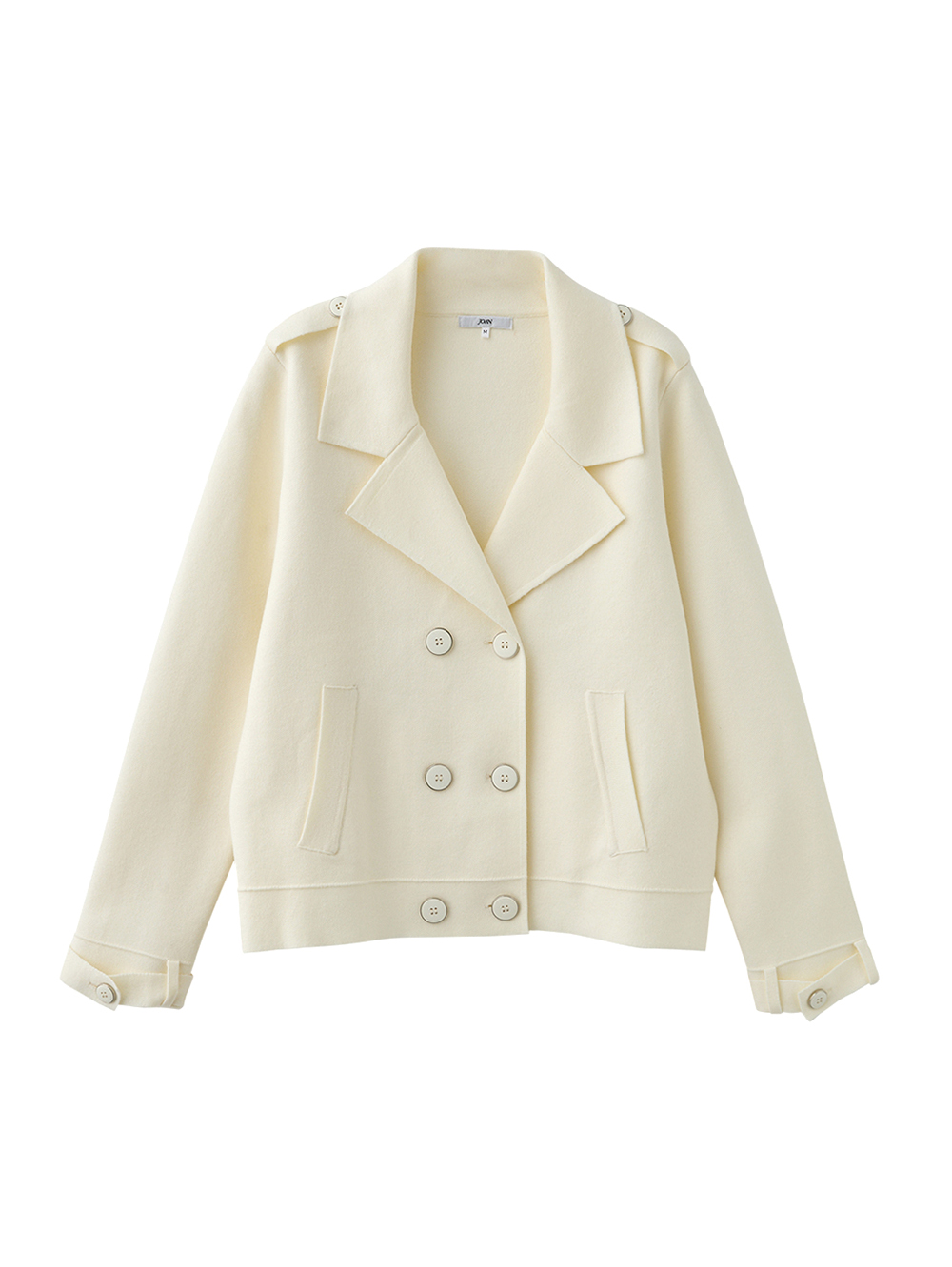 輕盈針織材質, 舒適又保暖 ,雙排釦加上翻領設計, 知性與大方並存, 適合各種場合