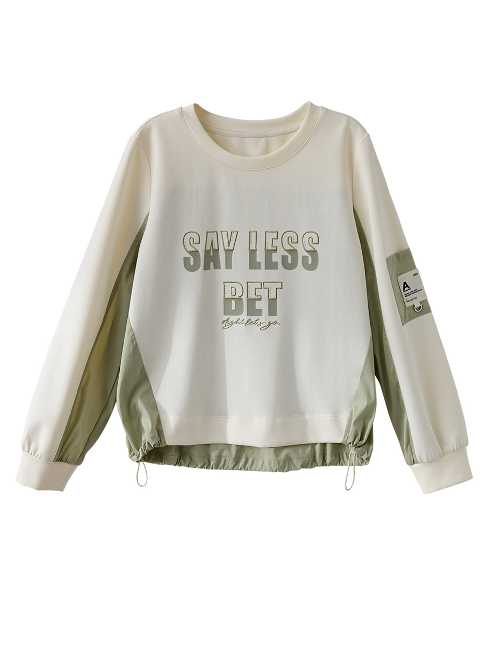 字母印花設計, 搭配異材質拼接剪裁, 提升整體層次感, 下擺抽繩可自由調節衣長, 讓下身搭配更多元。