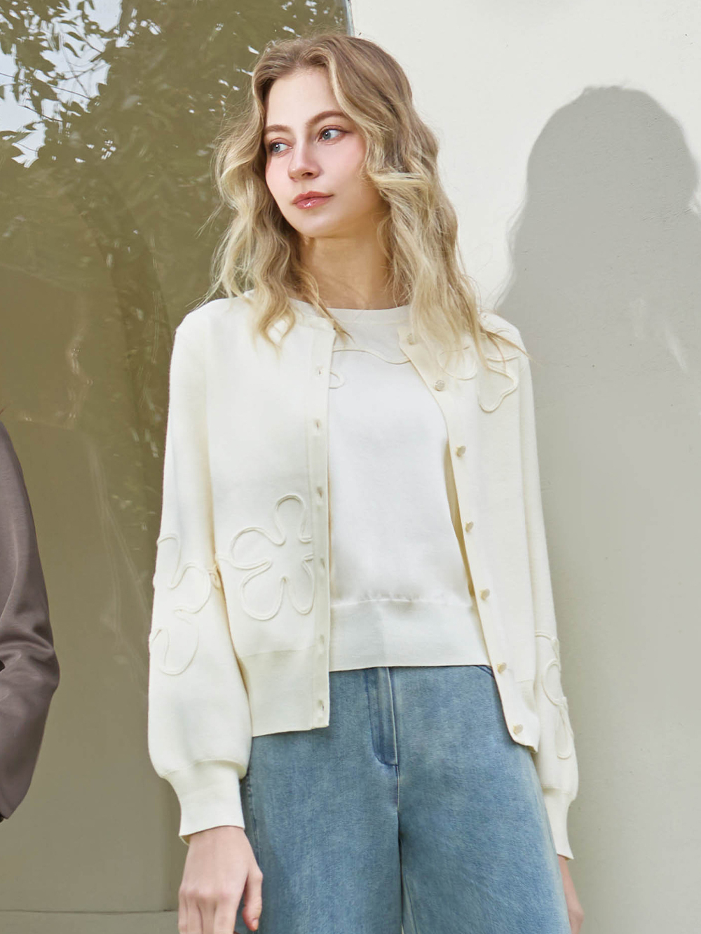 以細緻立體線勾勒出花朵輪廓, 像手繪般自然流動, 低調充滿設計感。 柔軟針織材質, 親膚舒適不刺癢。