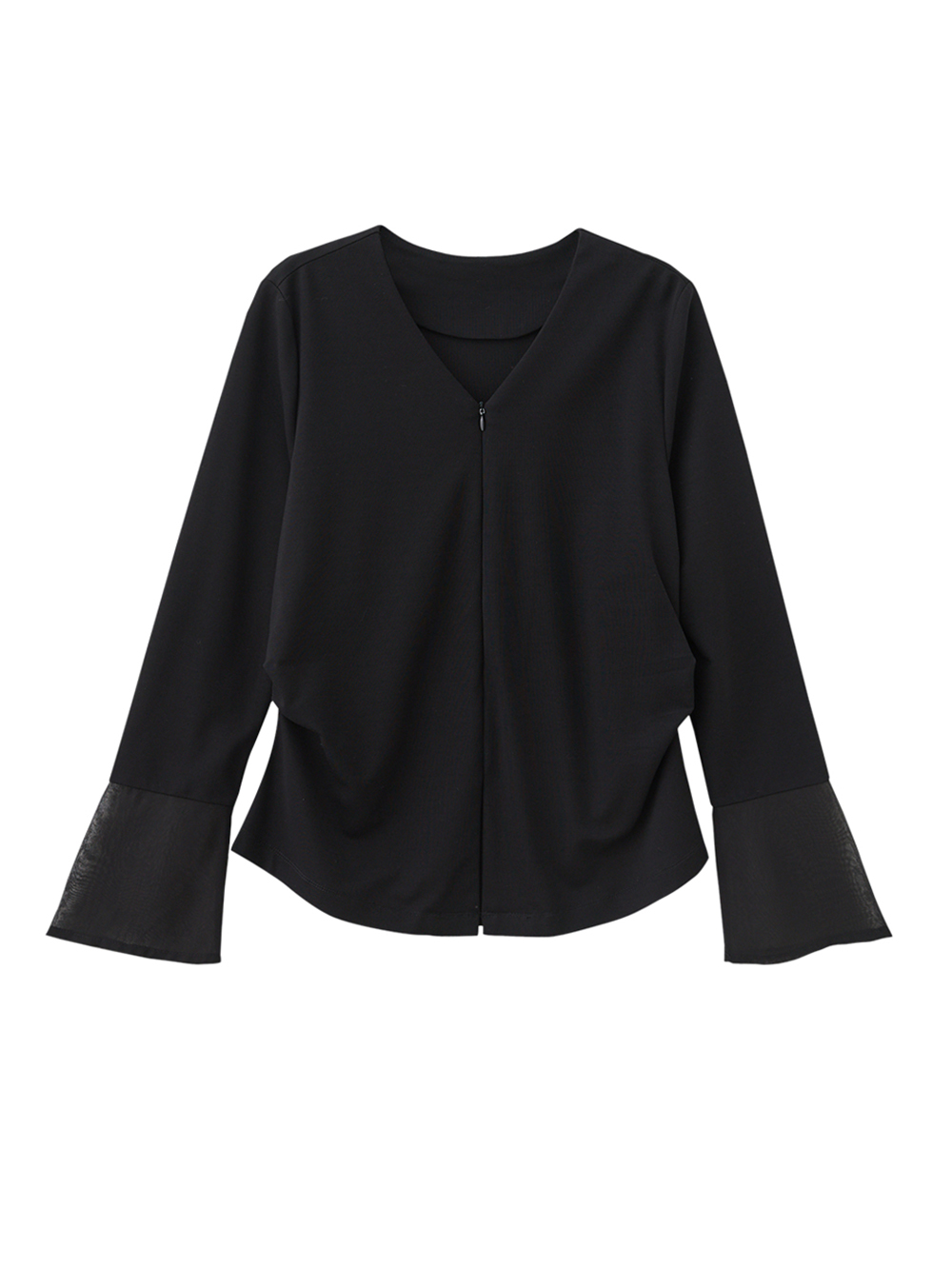 結合舒適與時尚的設計, 以簡約v領剪裁搭配雪紡喇叭袖, 正中隱形拉鍊設計, 穿脫方便, 也添增俐落感。